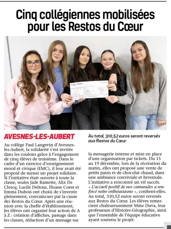 Dans le cadre du programme "Gouter mon territoire", différentes actions vont être programmées sur le niveau 5e. Atelier alimentation n°1 Lundi 26 janvier journée et mardi 27 janvier matin Atelier alimentation n°2 (Élaboration de recettes) Mercredi 11 mars, mercredi 1 avril et mercredi 13 mai