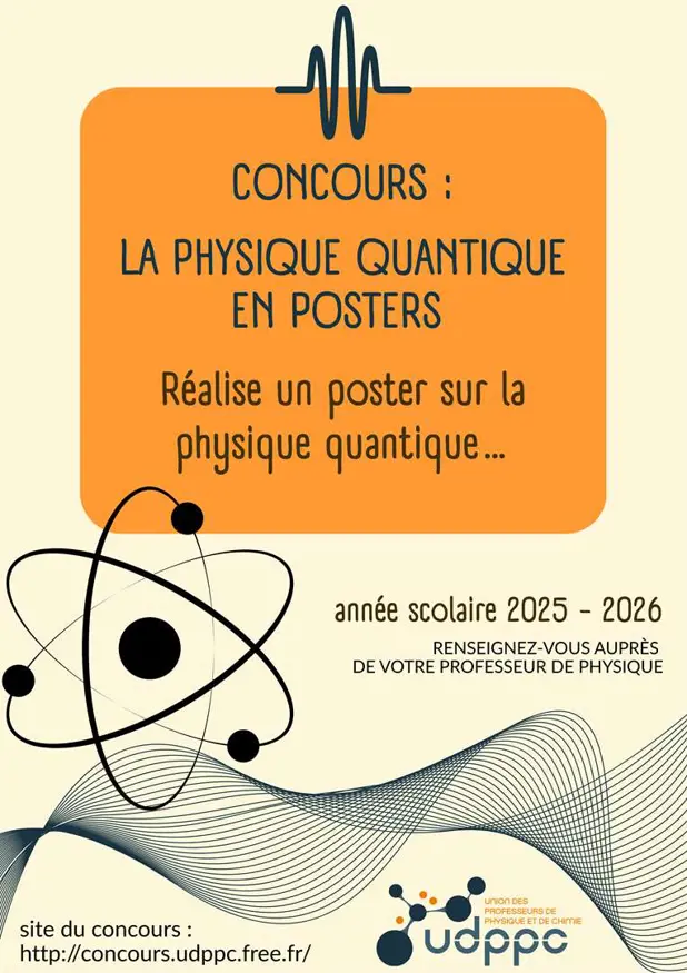 Bonjour à tous. Un concours de physique-chimie très original aura lieu cette année. Il s'intitule: "La physique quantique en poster". L'affiche est en pièce jointe et sera affichée au collège. Organisé par l’Union des professeurs de physique et de chimie (UdPPC) dans le cadre de l’Année internationale des sciences et technologies quantiques 2025, ce concours invite les élèves de l’enseignement secondaire à réaliser un poster au format A1 sur un concept, une expérience, une application ou une personnalité en lien avec la physique quantique. Encadrés par leur(s) enseignant(s), les participants... Lire la suite