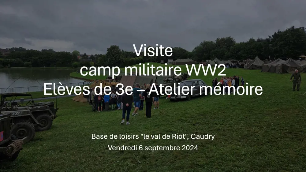 Le vendredi 6 septembre, les élèves de 3e de l'Atelier Mémoire, accompagnés de M.Gehringer et de Mme Duva, ont eu la possibilité de visiter le camp militaire installé sur la base de loisirs de Caudry. A l'occasion des 80 ans de la Libération, la municipalité caudrésienne a rassemblé différentes associations commémoratives afin de permettre aux scolaires de mieux comprendre cette période de l'histoire. Les élèves de 3e ont également pu découvrir les expositions attenantes retraçant l'Occupation. De quoi leur donner de nombreuses idées pour commémorer les 80 ans de la fin de la Seconde guerre mo... Lire la suite