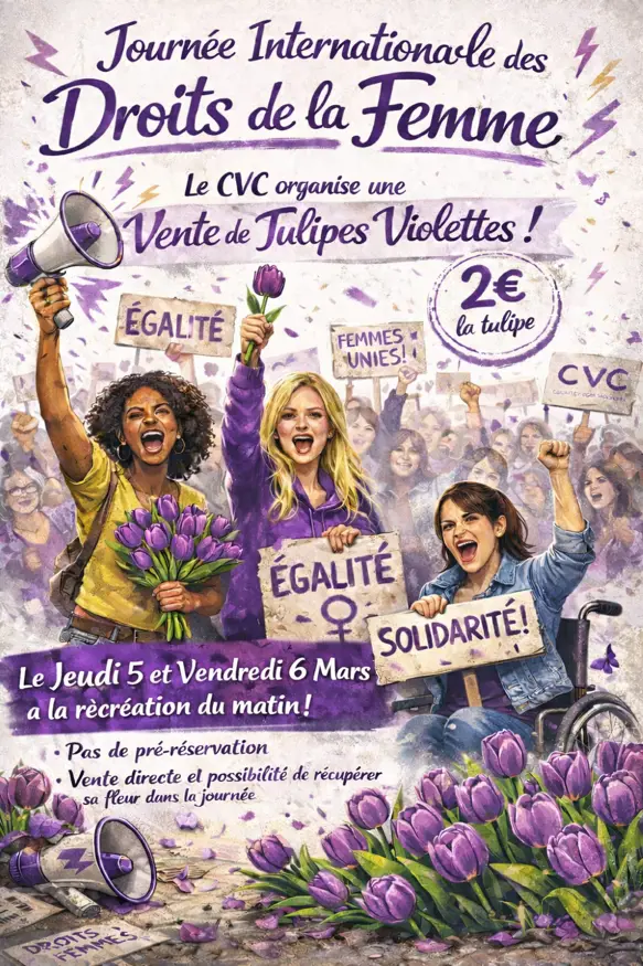 Afin de célébrer le 08 mars Journée internationale des droits des femmes, les élèves du CVC ont organisé une vente de tulipes violettes.